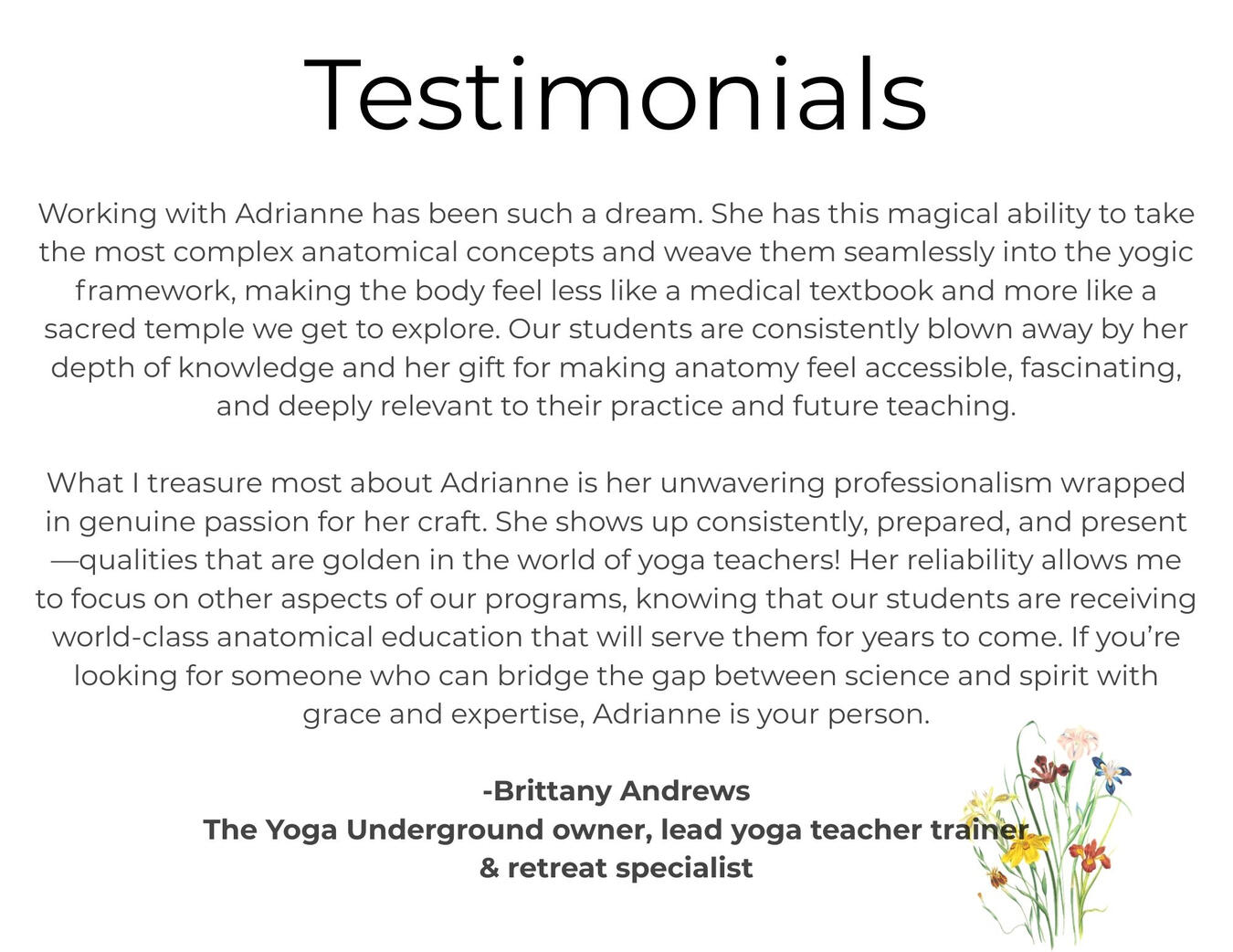 Adrianne has over a decade of experience teaching and studying yoga anatomy, philosophy and therapeutics for yoga teachers and students 1:1, in groups, workshop course study, yoga teacher trainings and treatment facilities.π¦
